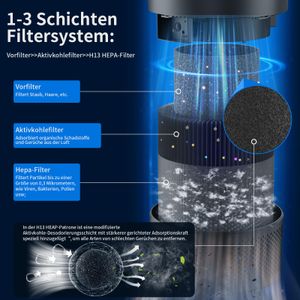 Der Chuboor Luftreiniger PJ01 bietet eine praktische Lösung für Allergiker und Haushalte, die ihre Raumluft verbessern möchten. Mit einem 3-stufigen Filtersystem – H13 HEPA, Aktivkohle und Vorfilter – entfernt er Partikel ab 0,3 Mikrometern. Pollen, Staub oder Tierhaare werden zuverlässig reduziert, während Gerüche durch den Aktivkohlefilter gebunden werden.
