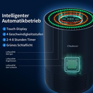 Der Chuboor Luftreiniger bietet hocheffiziente Luftreinigung mit 3-schichtigem Filtersystem, ideal für Allergiker. Leiser Betrieb und App-Steuerung ermöglichen komfortable Nutzung im Schlafzimmer.