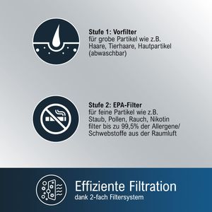 Der ProfiCare Luftreiniger überzeugt mit einem zweistufigen Filtersystem, das grobe Partikel und feine Staubpartikel bis zu 99,5 % effektiv entfernt. Ideal für Räume bis 20 m², arbeitet er ohne chemische Zusätze – praktisch für Allergiker oder Haushalte mit Haustieren. Übrigens lässt sich der Vorfilter einfach abwaschen, während der EPA-Filter langlebig konstruiert ist.