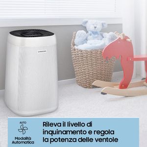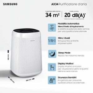 Der Samsung AX34R3020WW/EU Luftreiniger bietet saubere Luft mit einem effektiven 3-stufigen Reinigungssystem und Echtzeit-Luftqualitätsüberwachung dank Staubsensor.