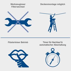 Die Montage unter der Decke spart Platz, und die Fernbedienung vereinfacht die Bedienung aus der Ferne. Im Lieferumfang sind Ersatzfilter enthalten, was die Wartung praktisch gestaltet. Mit 50 dB bleibt die Geräuschentwicklung im Rahmen typischer Werkstattgeräusche, wie etwa einem laufenden Schleifgerät.