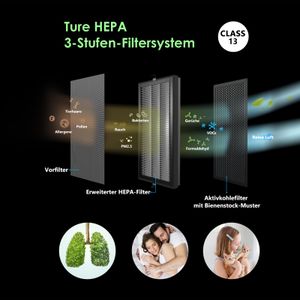 Für Allergiker oder Haushalte mit Rauchern könnte dieser Luftreiniger interessant sein. Er kombiniert einen dreistufigen Filter: Ein Vorfilter fängt groben Staub, der H13-HEPA-Filter entfernt mikroskopische Partikel wie Pollen oder Schimmelsporen, und der Aktivkohlefilter reduziert Gerüche. Die CADR von 500 m³/h bedeutet, dass die Luft in einem 60-m²-Raum alle 20 Minuten gereinigt wird.