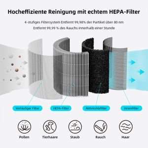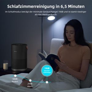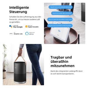 Vier Filterstufen inklusive Aktivkohle arbeiten gegen Gerüche aus Küche oder Tabakrauch. Im Schlafmodus bleibt’s bei 19 dB leiser als Flüstern, ideal für ungestörte Nächte. Der integrierte Ledergriff macht ihn mobil: Einfach vom Wohnzimmer ins Homeoffice tragen.