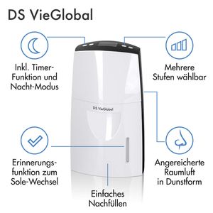 Erleben Sie ein angenehmes Raumklima mit dem DS VieGlobal Thermalsole-Verdunster, der Salzionen freisetzt und über Timer sowie Nachtmodus verfügt.