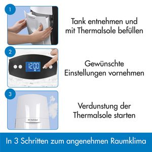 Der DS VieGlobal Thermalsole-Verdunster bietet eine Methode, um die Raumluft mit Salzionen anzureichern. Das Gerät arbeitet mit einem 2,5-Liter-Tank, der mit Thermalsole befüllt wird – die Lösung selbst ist allerdings nicht im Lieferumfang enthalten. In drei Schritten startet die Verdunstung: Tank befüllen, Einstellungen wählen und Betrieb aktivieren.