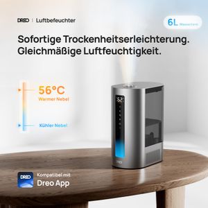 Der Dreo 6L Smart Luftbefeuchter kombiniert Funktionalität mit unkomplizierter Bedienung. Mit seinem 6-Liter-Tank hält er bis zu 60 Stunden durch, ohne ständiges Nachfüllen – praktisch für große Räume oder längere Nutzung. Dank Warm- und Kaltnebel passt er sich flexibel an Jahreszeiten oder persönliche Vorlieben an. Übrigens: Der warme Nebel erreicht in nur fünf Minuten 50°C, was bei trockener Luft schnell spürbar wird.
