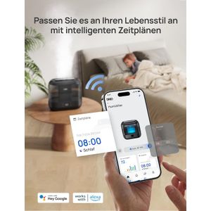 Was ihn besonders macht? Der integrierte Sensor misst die Luftfeuchtigkeit präziser als viele vergleichbare Modelle. Über die Dreo-App lässt sich das Gerät aus der Ferne steuern, wobei Echtzeitdaten und monatliche Verläufe einen guten Überblick bieten. Wer mag, bindet ihn per Alexa ins Smart Home ein. Drei Modi – manuell, automatisch, Schlaf – sorgen für Anpassung an unterschiedliche Bedürfnisse. Im Schlafmodus dimmt sich die Beleuchtung, und die Geräusche reduzieren sich spürbar.