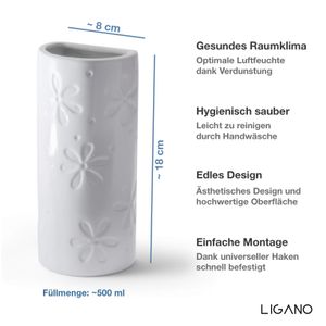 Der Ligano Heizkörper-Luftbefeuchter in Weiß bietet eine praktische Lösung für trockene Raumluft – besonders im Winter. Mit seinem schlichten Blumen-Motiv integriert er sich unaufdringlich in jedes Interieur. Die Keramikschalen verdunsten Wasser passiv, ohne Strom oder bewegliche Teile. Einfach befüllen, aufhängen, fertig.