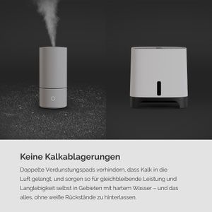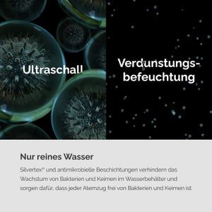 Hartes Wasser? Kein Problem. Die integrierte Anti-Kalk-Technologie und antimikrobiellen Verdunstungspads verhindern Ablagerungen und Bakterienwachstum. Das Silvertex-Entkeimungspad wirkt zusätzlich gegen Mikroorganismen.
