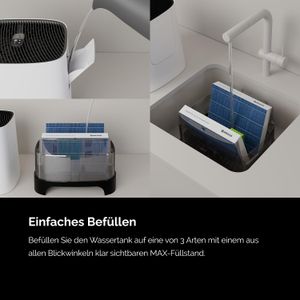 Mit einem 4,7-Liter-Tank reduziert sich die Häufigkeit des Nachfüllens deutlich. Drei verschiedene Einfülloptionen und ein gut sichtbarer Füllstand vereinfachen die Handhabung. Der Tank ist spülmaschinenfest, was die Reinigung beschleunigt.