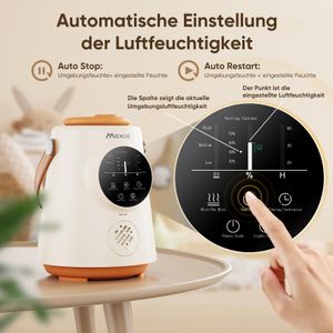 Der Maxcio Luftbefeuchter mit 2,5 Litern Fassungsvermögen passt gut in Schlafzimmer, Kinderzimmer oder kleinere Büros. Mit vier voreingestellten Feuchtigkeitsstufen – 32 %, 40 %, 60 %, 70 % – regelt er selbstständig, wann er startet oder pausiert. Praktisch, wenn man vergisst, ihn manuell zu bedienen.