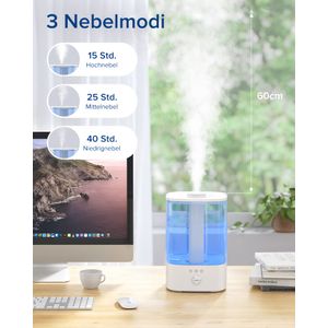 Dank Ultraschalltechnologie zerstäubt das Gerät Wasser in feine Partikel, die sich gleichmäßig im Raum verteilen. Wer mag, kann ein paar Tropfen ätherisches Öl hinzufügen, um gleichzeitig die Atmosphäre aufzuwerten. Die 360°-Dampfdüsen lassen sich flexibel ausrichten, sodass der Nebel gezielt strömt – etwa weg von empfindlichen Möbeln oder direkt in trockene Raumzonen.