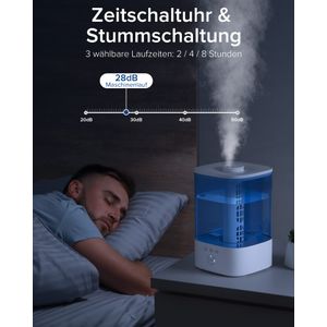 Mit 28 dB bleibt der Betrieb dezent im Hintergrund. Im Schlafmodus dimmen sich die LED-Lichter, bis auf eine kleine Statusanzeige. Drei Timer-Optionen (2/4/8 Std.) sorgen dafür, dass sich das Gerät automatisch abschaltet. Allerdings hört man bei voller Leistung durchaus ein leichtes Brummen, wie einige Nutzer anmerken.