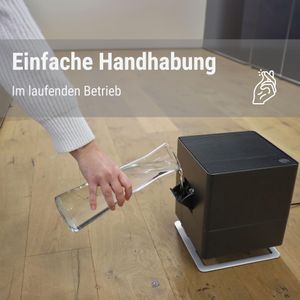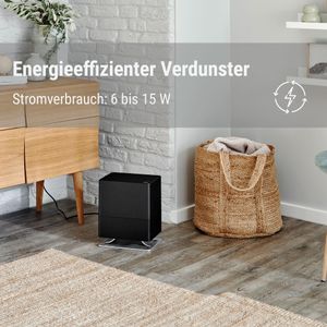 Mit nur 15 Watt Verbrauch arbeitet das Gerät äußerst sparsam. Die Abschaltautomatik stoppt den Betrieb bei leerem Tank, was zusätzlich Strom spart. Der 2,5-Liter-Wassertank muss je nach Nutzung etwa alle 12–24 Stunden nachgefüllt werden. Übrigens: Der Filter aus Pflanzen- und Textilfasern hält Staub zurück und lässt sich leicht wechseln. Ein Signal erinnert Sie daran, falls es Zeit dafür ist.
