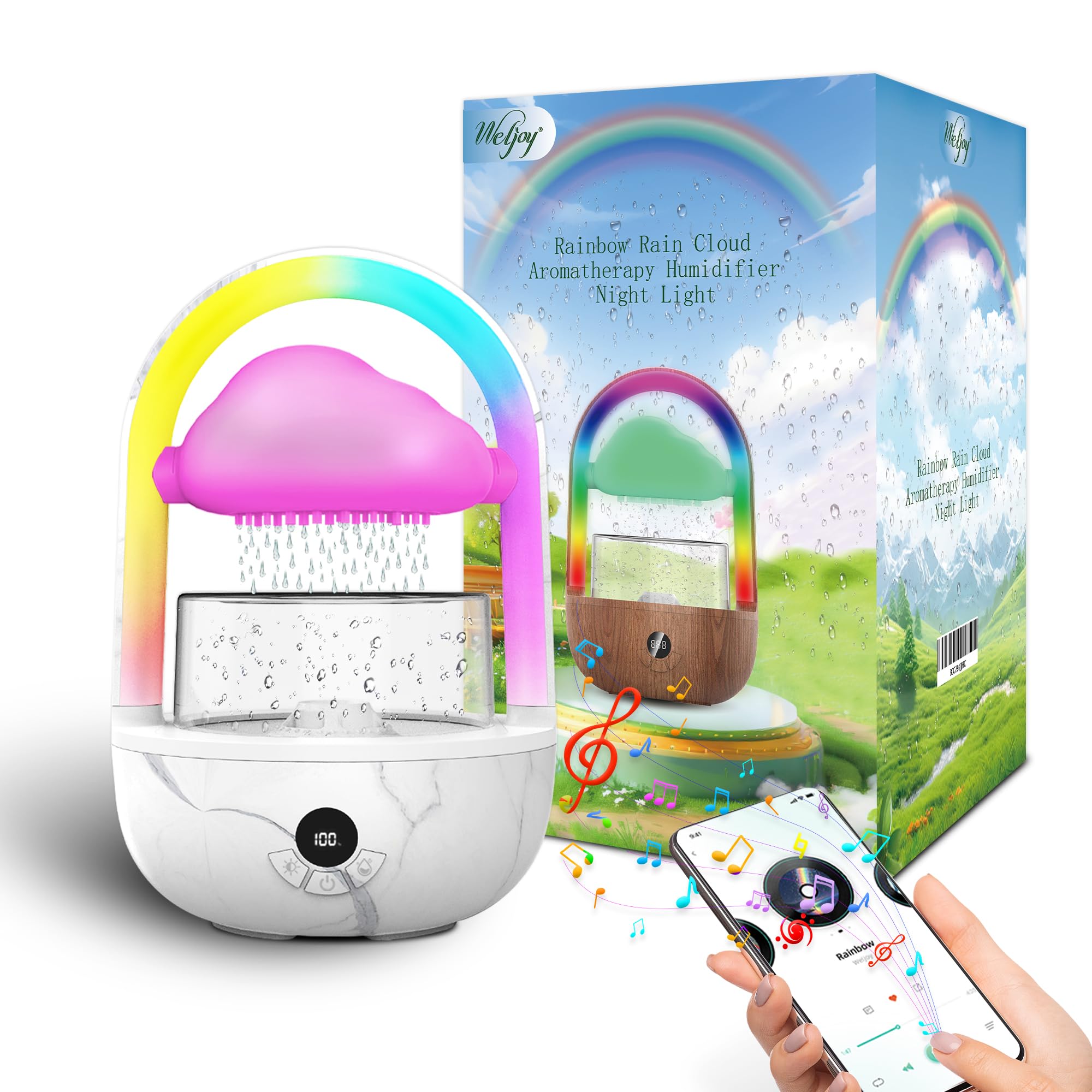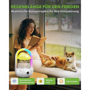 Der Weljoy Regenwolken Luftbefeuchter mit Regenbogenlicht bietet eine entspannende Atmosphäre durch App-Steuerung und 7-farbige LED-Leuchten, ideal für Schlaf- und Entspannungsräume.