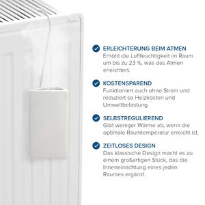 Das 4er-Set Heizkörper Luftbefeuchter von Joeji's Kitchen aus weißer Keramik sorgt für eine angenehme Raumluftfeuchtigkeit. Ideal für Rippenheizkörper, einfach in der Anwendung und stromlos.