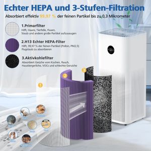 Drei Schichten arbeiten hier: Grobpartikel wie Haare bleiben in der äußeren Lage hängen. Die HEPA-Schicht fängt Mikropartikel bis 0,1 µm ein, etwa Pollen oder Feinstaub. Die Aktivkohleschicht aus Kokosnussschalen soll Gerüche binden. Einige Kunden merken jedoch an, dass die Kohleschicht dünner ausfällt als erwartet – bei starken Küchendämpfen könnte das limitieren.