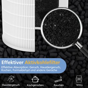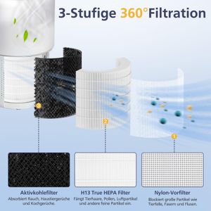 Was steckt drin? Zwei Filter mit dreistufigem System: Ein H13-True-HEPA-Filter fängt selbst feinste Partikel wie Pollen oder Staub ein. Der Aktivkohleblock reduziert Gerüche von Haustieren, Rauch oder Küchendünsten. Dazu kommt ein Nylon-Vorfilter, der groben Schmutz abhält. Zusammen sorgen sie für spürbar frischere Luft, besonders in Stadtwohnungen oder Haushalten mit Tieren.