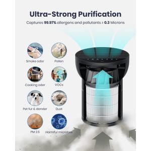 Designed for spaces up to 441 square feet, this tabletop purifier combines a four-layer filtration system with practical automation. Its H13 True HEPA filter captures particles as small as 0.3 microns—think pollen, dust mites, or pet dander—while activated carbon tackles odors from cooking or household products. A pre-filter traps larger debris, and anion technology neutralizes lingering airborne irritants.