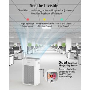 Con un CADR de 305 m³/h, renueva el aire de una habitación de 20 m² en apenas 10 minutos. Funciona a tres velocidades y cuenta con modos automático, sueño y UV, seleccionables mediante panel táctil. En modo automático, sensores detectan cambios en la calidad del aire y ajustan la potencia, mostrando el estado mediante luces: verde (óptimo), amarillo (moderado) o rojo (deficiente).
