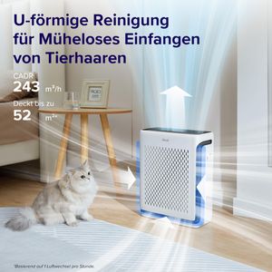 Funciona en habitaciones de hasta 52 m², renovando el aire dos veces por hora. Su entrada en forma de U atrapa pelos de animales o polvo grueso con facilidad, y el prefiltro lavable prolonga la vida útil del sistema. En modo automático, ajusta la velocidad según la calidad del aire, aunque algunos usuarios notan que tarda unos segundos en reaccionar.