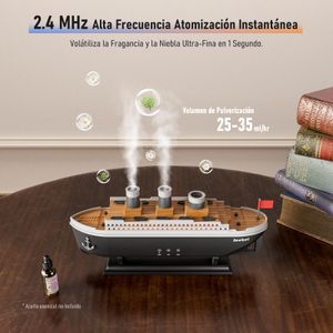 El difusor de aroma Jeebel combina funcionalidad y diseño en un formato compacto. Con su estructura en forma de barco, integra varias opciones en un solo dispositivo: humidificación básica, aromaterapia y efectos de iluminación ambiental. Ideal para espacios reducidos como mesas de noche o escritorios, su capacidad de 300 ml permite un uso continuo sin recargas frecuentes.