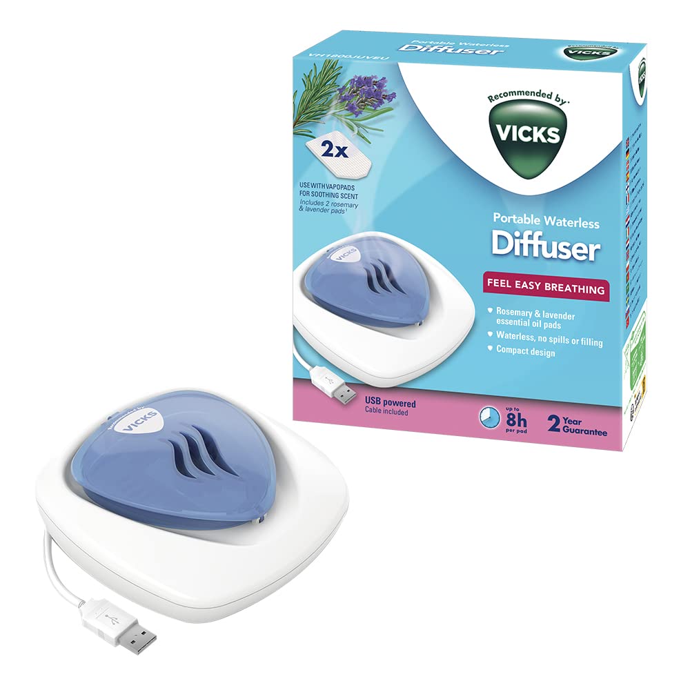 Disfruta de una respiración sencilla con el difusor portátil sin agua de Vicks, ideal para niños, con luz nocturna y aceites esenciales.