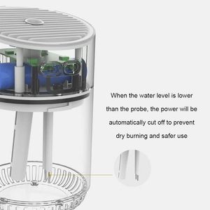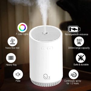 Humidificador ultrasónico portátil con capacidad de 320 ml, ideal para espacios reducidos. Incluye luz LED de 7 colores y apagado automático.
