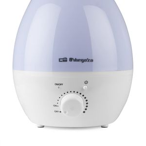 Humidificador Orbegozo HU 2013 con luces LED de 7 colores, capacidad de 1,3 L, vapor frío y bandeja para aceites aromáticos.