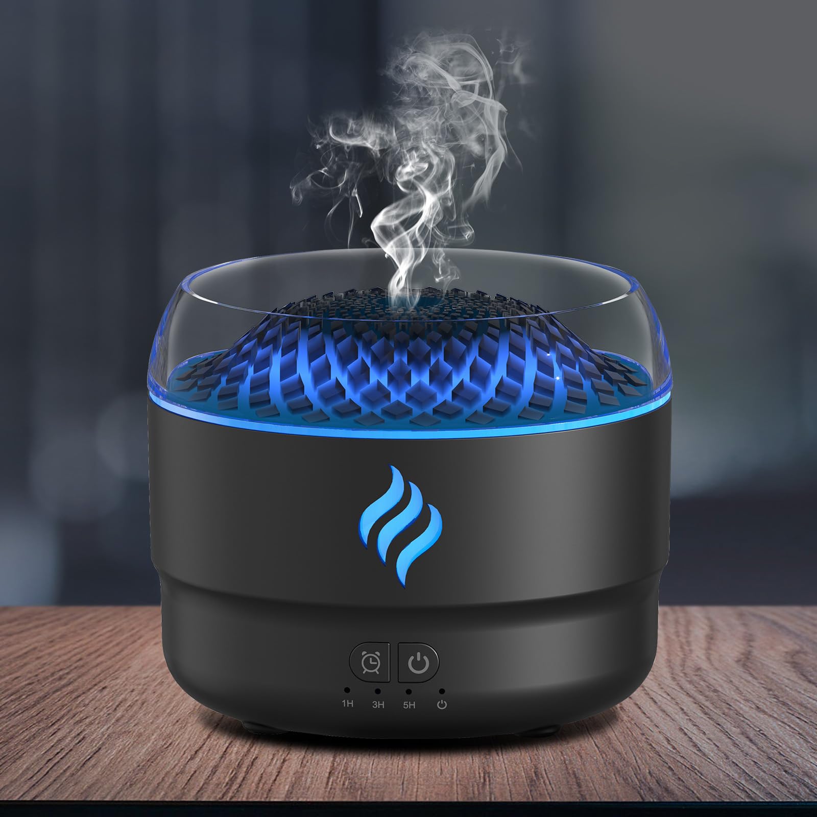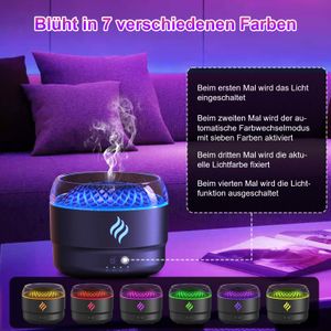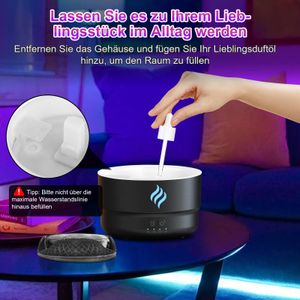 Humidificador de aceites esenciales con efecto llama, luces LED de 7 colores, temporizador y apagado automático. Perfecto para aromaterapia y ambiente relajante.