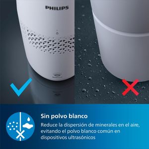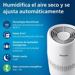 Humidificador evaporativo Philips Serie 2000: reducción del 99.97% de bacterias, ideal para habitaciones hasta 31 m², ultra silencioso y con capacidad de 2L.