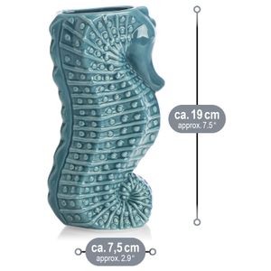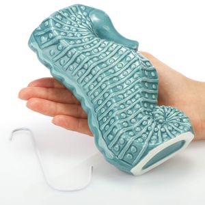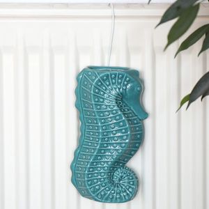 Viene en un set de tres unidades con diseños de caballitos de mar en blanco, gris y turquesa. Cada pieza mide 19 cm de alto, ideal para radiadores estándar. El metal esmaltado aporta durabilidad, aunque algunos usuarios mencionan variaciones menores en el acabado de pintura.