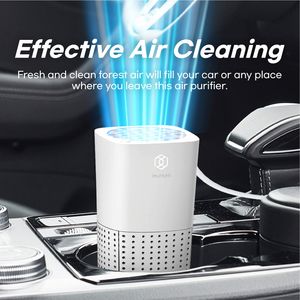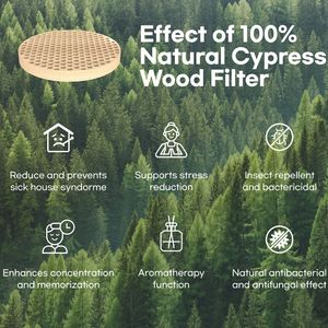 Purificador de aire portátil con diseño de madera de ciprés y filtración de 4 etapas, ideal para espacios pequeños como coches y oficinas.