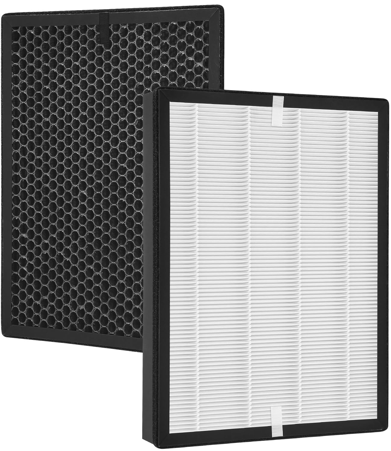 El marco de polipropileno aporta resistencia, incluso en ambientes húmedos. La instalación tarda segundos: ambos filtros encajan sin ajustes forzados. El HEPA mide 36,4 x 27,7 x 5 cm; el de carbón, 36,4 x 27,7 x 1 cm.