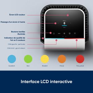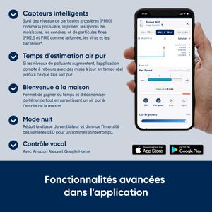 Gestion intuitive via l’application : Trois capteurs mesurent en permanence la qualité de l’air, tandis que l’appli propose des réglages automatisés ou manuels. Vous suivez les progrès, consultez l’état du filtre et recevez des alertes de remplacement grâce à la puce RFID intégrée. Comptez environ un an d’autonomie pour le filtre, selon l’utilisation.