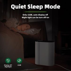 L’appareil inclut un capteur de qualité d’air avec code couleur : rouge pour une pollution élevée, orange pour une situation modérée, et bleu lorsque tout est optimal. Pratique, il ajuste automatiquement la vitesse du ventilateur selon les données recueillies, réduisant ainsi sa consommation (34 W). En mode nuit, le bruit chute à 22 dB – comparable à un léger souffle – pour ne pas troubler votre sommeil.