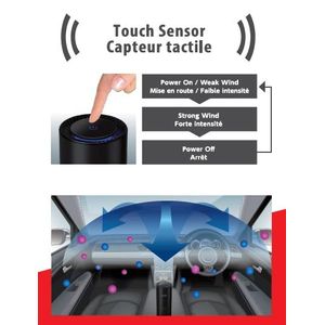 L’alimentation se fait via USB ou adaptateur allume-cigare (12/24 V), permettant une utilisation mobile. Une batterie externe est aussi compatible, bien que l’autonomie dépende de sa capacité. Deux niveaux de puissance adaptent le débit d’air à vos besoins, avec un bruit maximal de 40 dB – comparable à un murmure léger. Le panneau tactile simplifie la gestion des modes.