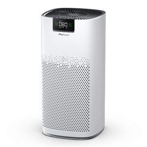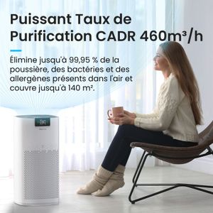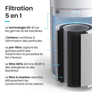 Le Pro Breeze Purificateur d’air couvre jusqu’à 140 m², une surface adaptée aux grands espaces ouverts. Son système combine trois étapes de filtration : un pré-filtre capture les grosses particules, le HEPA-13 retient 99,95 % des allergènes, et le charbon actif neutralise les odeurs. Vous pouvez activer séparément la lampe UV-C pour cibler les microbes et l’ioniseur pour affiner la purification.