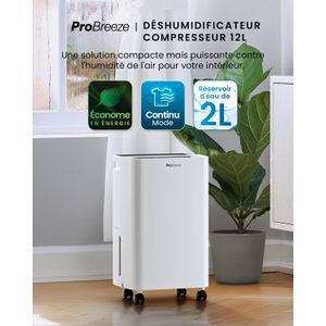 Déshumidificateur Pro Breeze 12L/jour, compacte et économe en énergie, idéal pour réduire l'humidité et sécher le linge rapidement.