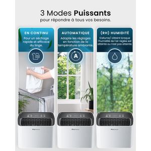L’écran LED affiche l’hygrométrie en temps réel, permettant de régler le taux souhaité entre 30% et 80%. Une fois le seuil atteint, l’appareil s’éteint automatiquement. Certains utilisateurs soulignent son efficacité sur les murs humides ou les sous-sols, notant une amélioration en 48 heures. En revanche, le bruit (39 dB) persiste même en mode nuit, le rendant peu adapté aux chambres si vous êtes sensible aux sons mécaniques.