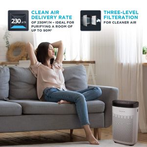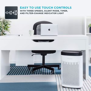 Trois vitesses de ventilation sont disponibles, dont un mode silencieux idéal pour la nuit. La minuterie permet de programmer le fonctionnement, et l’indicateur de remplacement de filtre évite les oublis. Les commandes tactiles réagissent bien, même si certains utilisateurs notent qu’elles peuvent être moins intuitives dans l’obscurité.