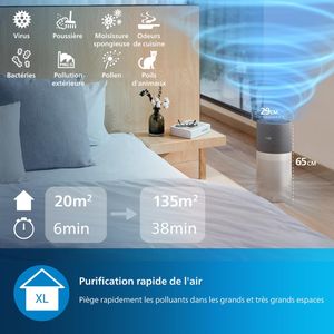 Conçu pour les espaces jusqu’à 135 m², ce purificateur d’air combine performance et simplicité d’utilisation. Son débit d’air purifié (CADR) de 520 m³/h renouvelle l’atmosphère d’une pièce de 20 m² en moins de six minutes. Idéal pour les grands salons ou les zones ouvertes, il s’adapte aussi bien aux maisons qu’aux bureaux.
