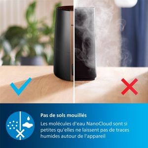 Humidificateur Philips Série 3000 : technologie NanoCloud, ultra-silencieux, idéal pour pièces jusqu'à 45 m² avec réglages personnalisés.
