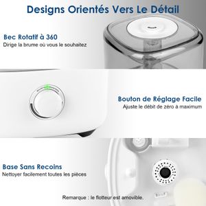 Le design minimaliste s’intègre sans effort à la déco. La compatibilité avec les huiles essentielles ajoute une polyvalence appréciable, même si cela reste optionnel. Enfin, le prix abordable en fait un choix raisonnable pour ceux qui souhaitent tester un humidificateur sans investissement majeur.