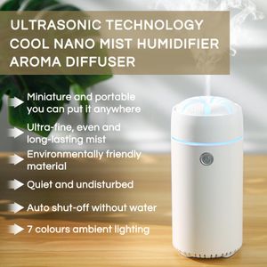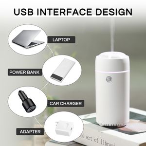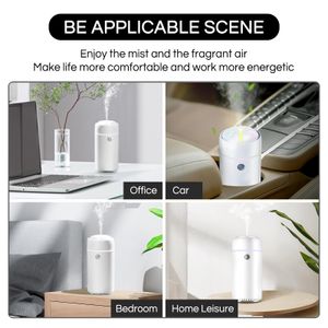 Diffuseur et humidificateur portable, idéal pour la voiture, avec éclairage LED, huiles essentielles, et arrêt automatique.