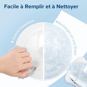 - Remplissage par le haut : Plus besoin de retourner l’appareil. Ajoutez de l’eau directement sans risque de débordement.