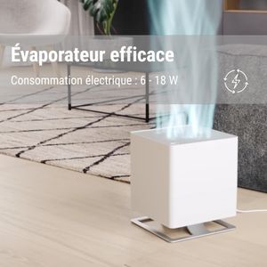 L’humidificateur Oskar de Stadler Form vise à améliorer le confort des pièces jusqu’à 50 m² grâce à une gestion équilibrée de l’humidité. Son évaporateur fonctionne avec une consommation énergétique modérée (18 W), ce qui en fait un choix adapté pour un usage régulier sans impact excessif sur la facture.