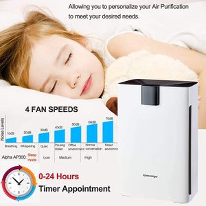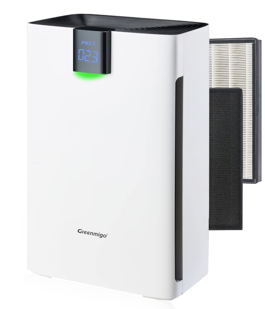Le purificateur d'air Greenmigo AP300 assure un air pur et sain grâce à son filtre HEPA et à charbon actif, idéal pour les allergiques et propriétaires d'animaux.