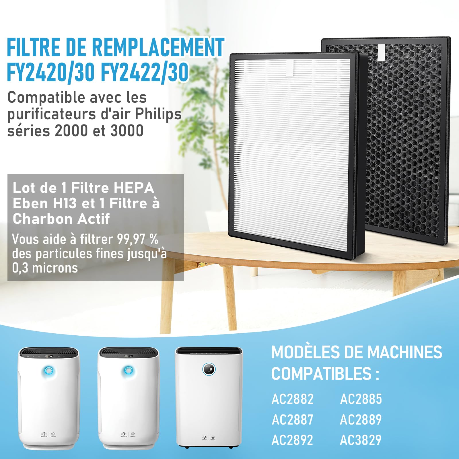 Ces filtres de remplacement compatibles avec les purificateurs Philips série 2000 et 3000 (AC2882, AC2887, AC3829, etc.) offrent une solution pratique pour maintenir la qualité de l’air intérieur. L’ensemble inclut un filtre HEPA et un filtre à charbon actif, conçus pour remplacer les modèles d’origine FY2422/30 et FY2420/30.