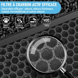 Le filtre HEPA capture les particules jusqu’à 0,01 mm — poussières, pollens ou acariens — tout en restant perméable pour limiter la perte de pression. Quant au filtre à charbon, sa densité de 600 g/m³ absorbe les odeurs persistantes, idéal pour les foyers avec animaux ou fumeurs. Les cadres en PP résistent à l’humidité, et leur remplacement est conseillé tous les six mois.